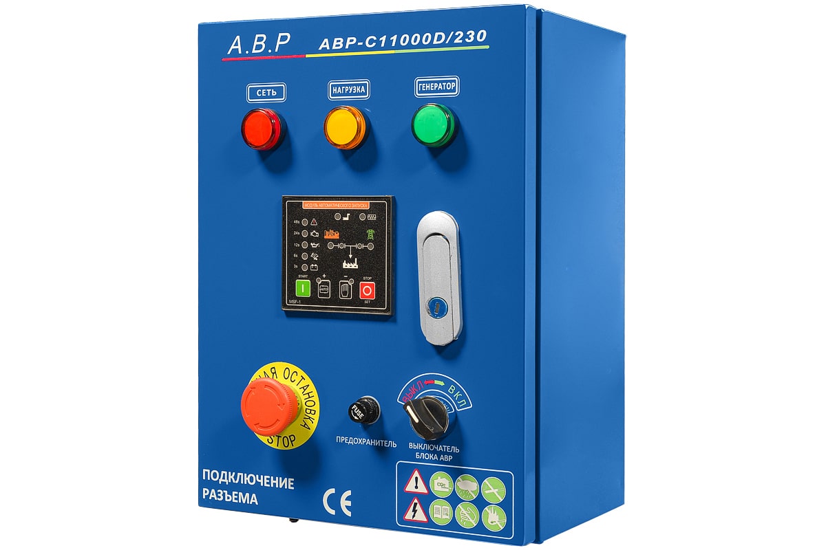 Блок АВР для дизельного генератора от 10 до 12 кВт включает в себя систему автозапуска (автоматического ввода резервного электропитания). При появлении основного источника электропитания происходит отключение электростанции. Блок автоматического управления для контроля наличия напряжения в сети. Блок АВР-С 11000D/230 совместим со следующими генераторам: 100054 Дизель генератор TSS SDG 11000EHA 100057 Дизель генератор TSS SDG 12000EHA
