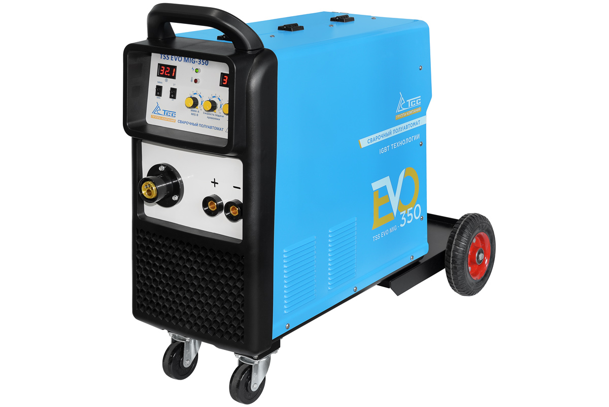TSS EVO MIG-350 - Сварочный полуавтомат инверторный. Корпус из листовой стали, надежно защищает внутренние элементы от повреждения. Предназначен для полуавтоматической сварки в среде защитных газов (MIG/MAG), а также ручной дуговой сварки покрытым электродом (ММА). Аппарат имеет защиту от перегрузки, индикатор перегрева и неисправности, обеспечивая высокий уровень безопасности и надежность устройства. Так же данный аппарат имеет защиту от скачков напряжения. Высокое напряжение холостого хода обеспечивает легкость поджига сварочной дуги. Высокая стабильность сварки в реальном времени, простое интуитивно понятное управление сварочными параметрами.